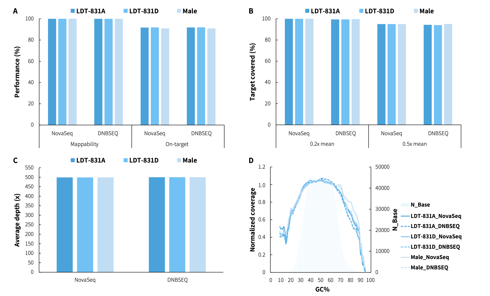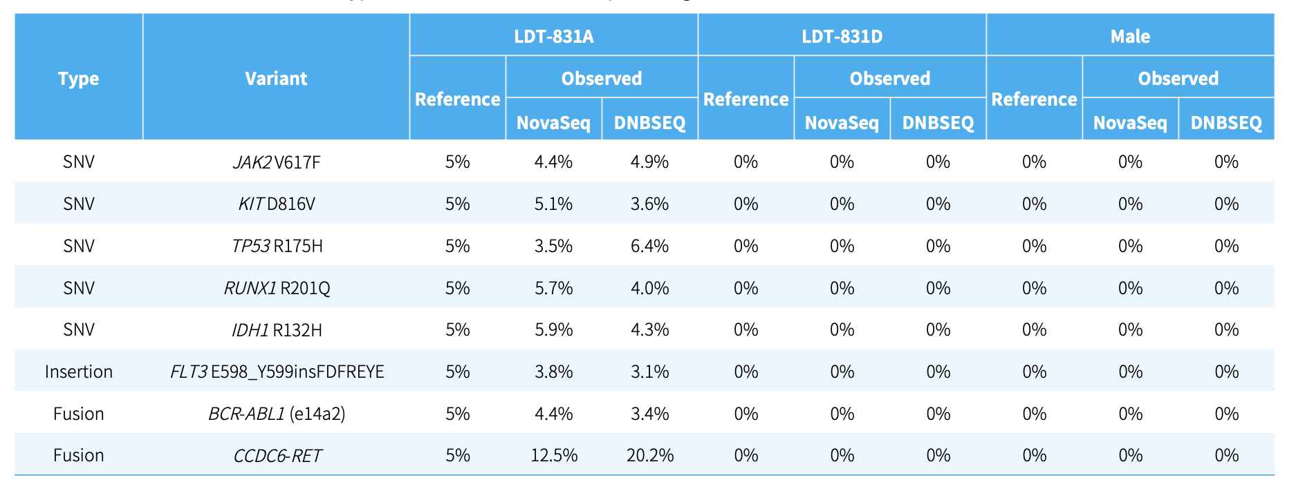 Note: LDT-831: hematologic malignancy gDNA quality control (LDT Bioscience; LDT-831A: AF = 5%; LDT-831D: AF = 0%). Male: human genomic DNA standard (Promega, G1471).